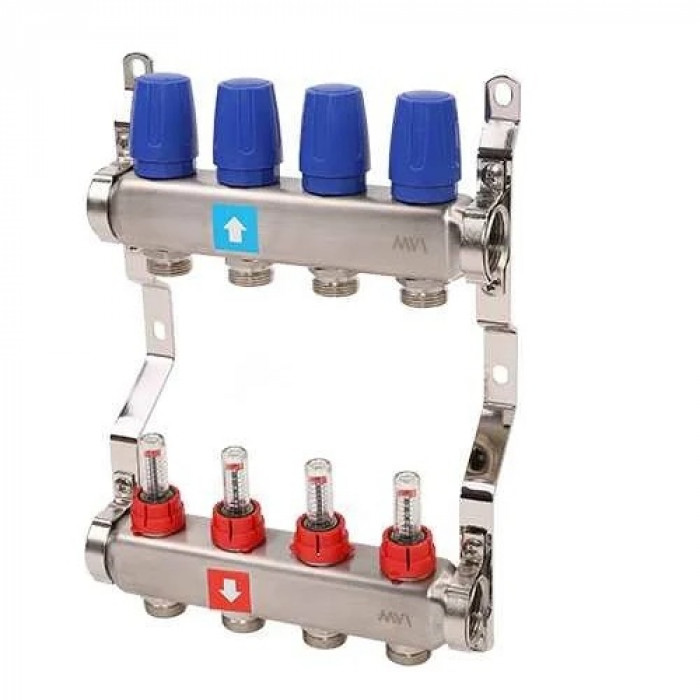 Функция: позволяют визуально контролировать и точно регулировать объемный поток теплоносителя (л/мин) в каждой отдельной петле. Регулировка происходит путем вращения колпачка расходомера. Это критически важно для балансировки системы теплых полов.