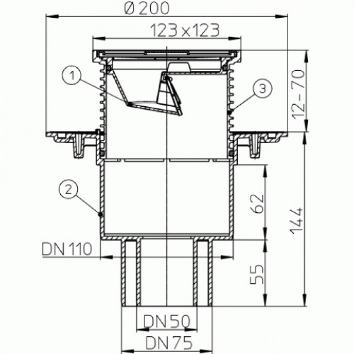 Діаметр випуску (Підключення до каналізації): Зазвичай DN50 або DN75, залежно від повних технічних даних (трап для балконів часто має менший діаметр, ніж для дахів).
