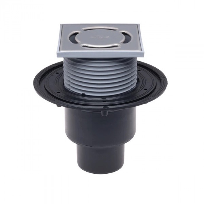 Трап має можливість регулювання висоти завдяки надставному елементу, що дозволяє точно підігнати рівень решітки під товщину фінішного покриття (плитка, стяжка).